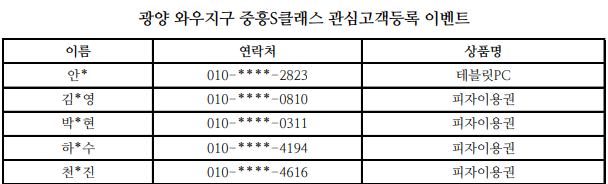 광양 와우지구 중흥S-클래스 관심고객등록 이벤트 당첨자를 발표하겠습니다.